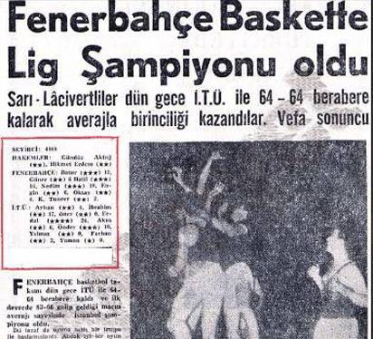 30 Ocak 1972 Fenerbahçe: 80 - Galatasaray: 74